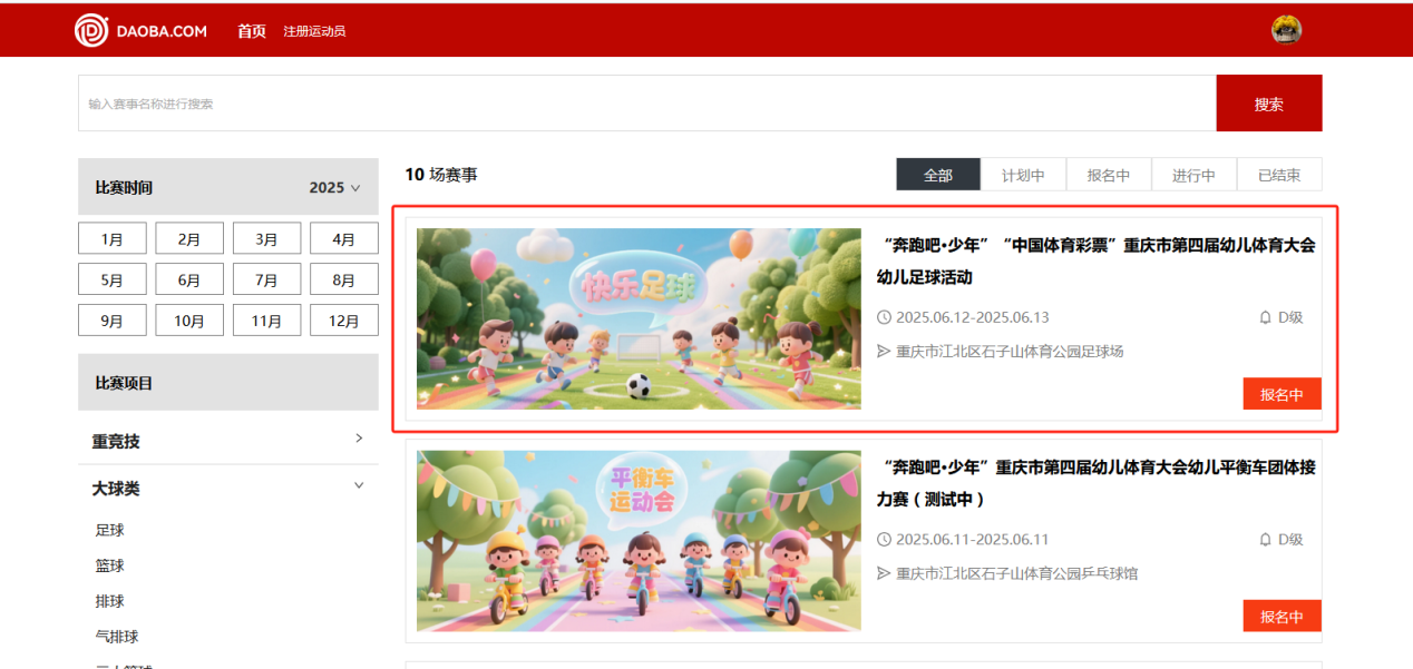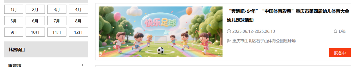 (三)登录成功后,选择需报名的比赛:“奔跑吧∙少年”“中国体育彩票”重庆市第五届幼儿体育大会幼儿足球活动