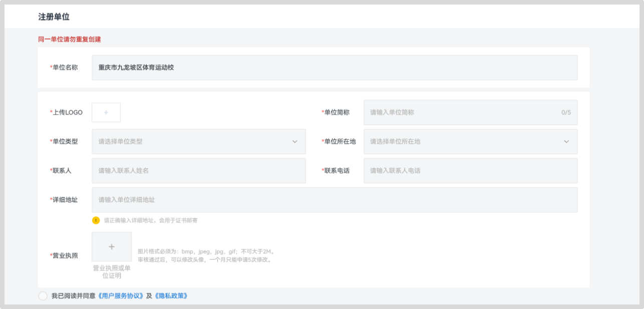 (二)在单位注册页面中,按要求填写信息,确认无误后点击“提交”。注:同一单位请勿重复注册!审核时将随机删除多余账号。