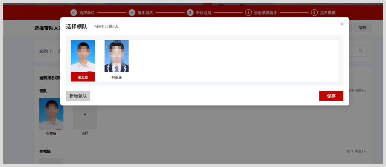 (六)点击“新增”添加带队人员,按要求填写信息。添加完成后,返回带队人员页面,点击领队下的灰色块,在带队人员列表中选择领队,点击“保存”。出现头像代表选择成功,主教练和助理教练同上。检查无误后提交,报名完成。