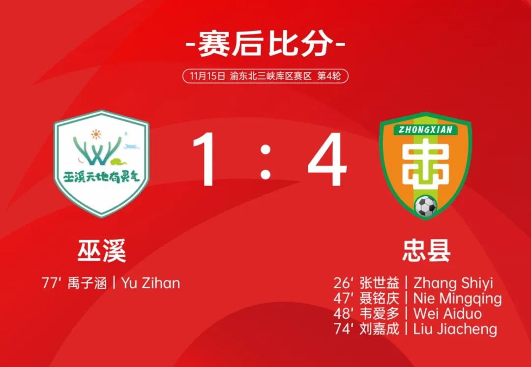 第26分钟,忠县获得角球机会,58号球员张世益高高跃起,头球破门,为客场取得领先。第47分钟,24号球员聂铭庆小角度左脚再进一球,帮助忠县客场2:0领先。仅仅1分钟之后,26号外卡球员韦爱多左脚劲射,皮球击中左侧立柱破门,3:0。第74分钟,41号刘嘉成后点包抄得手,4:0。第77分钟,巫溪77号球员禹子涵直接任意球破门,帮助球队扳回一球,将比分锁定为1:4。