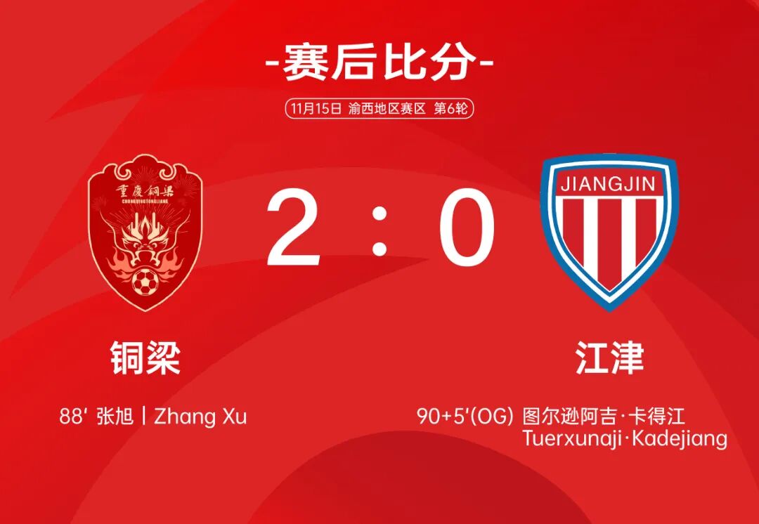 第88分钟,铜梁右边路传中,7号球员禁区内头球吊入球门左上死角,江津门将鞭长莫及,场上比分变成1:0。第95分钟,铜梁获得前场任意球机会,江津7号球员吐尔逊防守时不慎自摆乌龙,场上比分变成2:0。最终,主场作战的铜梁2:0获胜,送给江津首败。