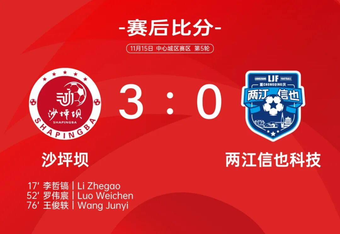 比赛进行到第17分钟,沙坪坝设计了巧妙的角球战术,11号球员李哲镐头球破门,帮助球队1:0领先。下半场第52分钟,沙坪坝7号球员罗伟宸禁区内接队友传球,虽然射门时右脚没能吃准部位,但皮球歪打正着击中右侧立柱后滚入球门,场上比分变成2:0。第76分钟,沙坪坝29号球员王俊轶中路接队友右侧传中,轻松头球破门,将比分锁定为3:0。