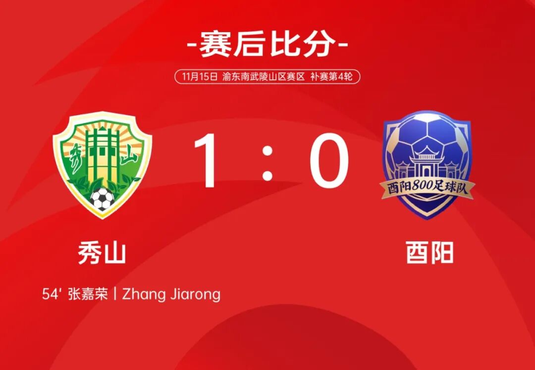 上半场双方0:0互交白卷,下半场第54分钟,秀山右路传中,酉阳后点防守时出现漏人情况,秀山30号球员张嘉荣头球轻松破门,最终秀山主场1:0获胜。4轮比赛后,秀山4战全胜,积12分排名渝东南武陵山区赛区第一,第二名和第三名的武隆和石柱分别积7分和6分,在小组赛仅剩1轮的情况下,秀山提前锁定8强名额,成为41支参赛队伍中第一支晋级的球队。