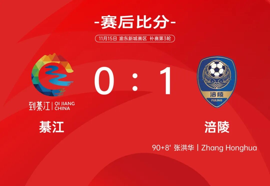 常规时间90分钟,双方你来我往,拼抢异常激烈,但始终没能取得进球。补时阶段,涪陵77号张洪华禁区右侧接队友传球,冷静推射远角破门,上演精彩绝杀,帮助球队客场战胜綦江,全取三分。4轮比赛后,涪陵2胜1平1负,积7分排名渝东新城赛区第1,长寿和南川分列第2和第3,出线形势扑朔迷离。