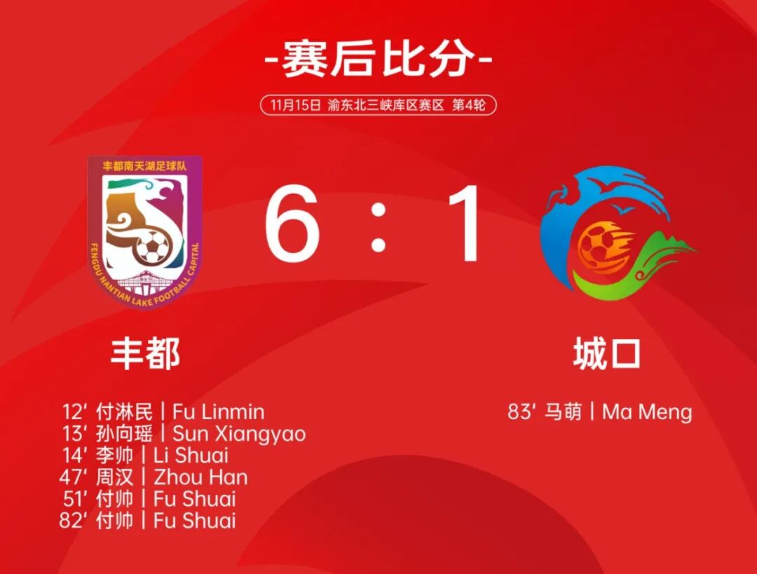 下半场开场仅2分钟,丰都再次闪击得手,9号球员周汉帮助主队4:0领先。尽管早早取得大比分领先,但丰都攻势不减,付帅分别在第51分钟和第82分钟破门,将比分改写为6:0。第83分钟,城口由15号马萌打入一球。