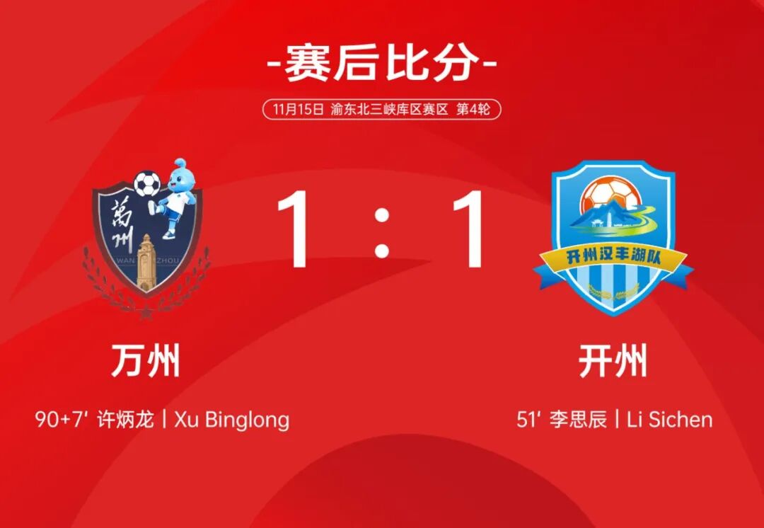 最终,双方1:1握手言和。4轮比赛后,丰都4战全胜,积12分领跑,开州和万州各取1分,目前以8分分列赛区第2和第3名。