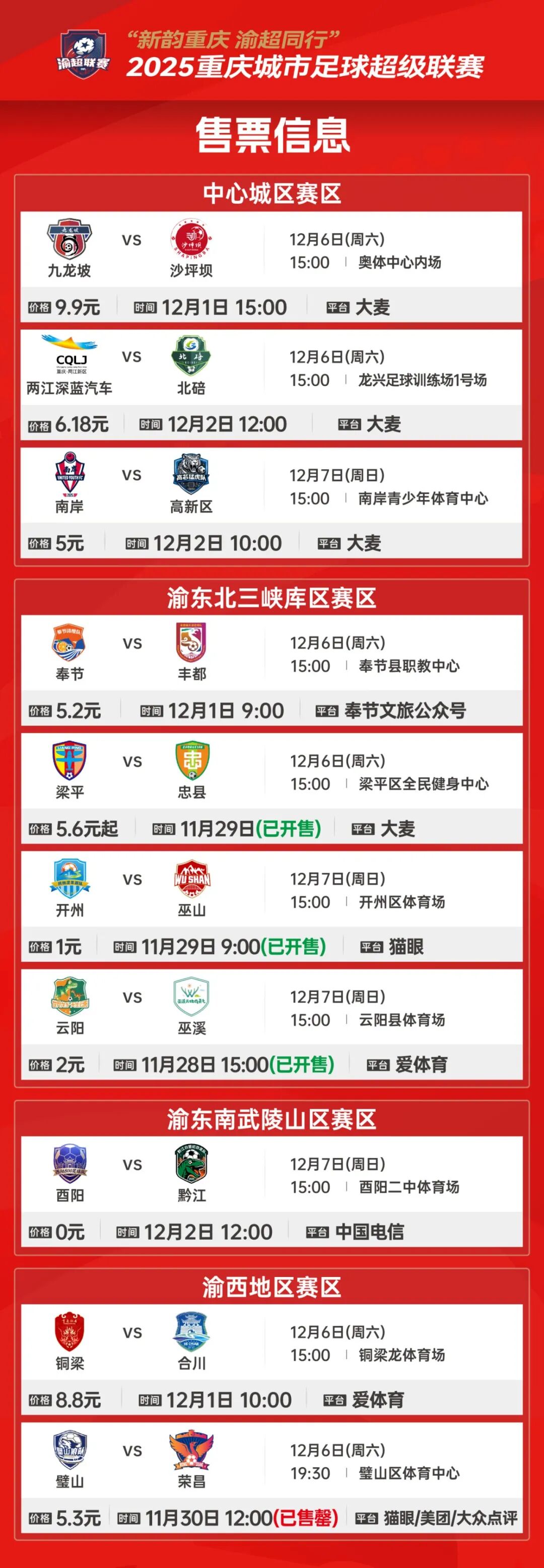 各赛区售票信息(12.6-12.7)