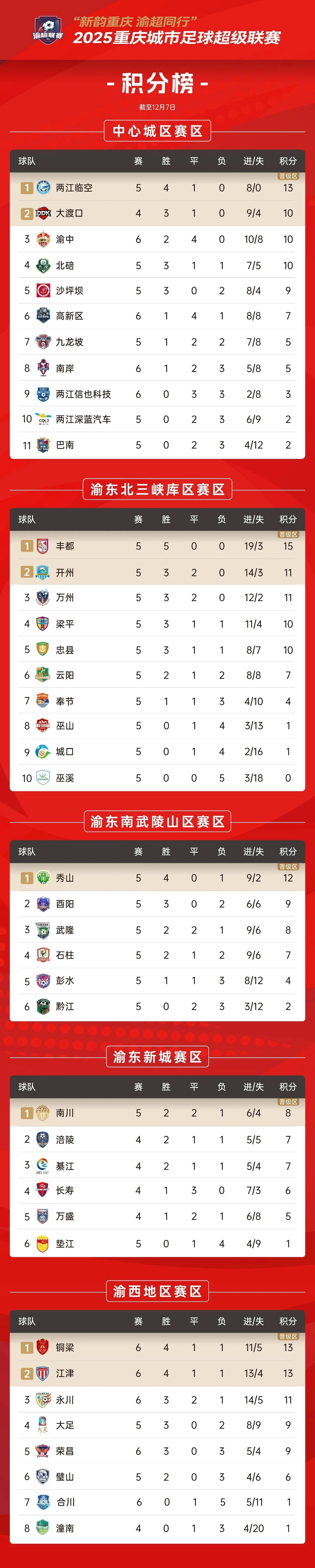 渝超联赛积分榜(截至12月7日)