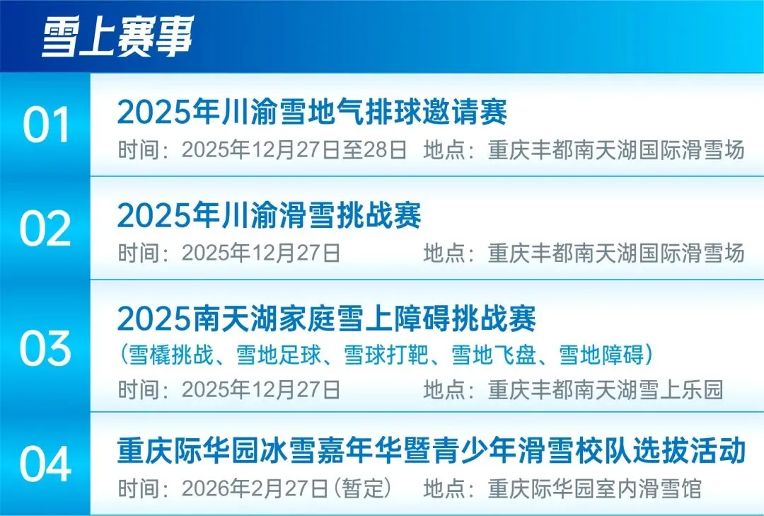 本届冰雪运动季期间,还将同步举办第六届丰都南天湖冰雪旅游季,以“文化+体育+旅游+美食”跨界融合为模式,精心策划了雪国列车、雪地坦克、“冰人”大作战、NPC巡游、雪地烧烤、年猪节等27项覆盖全年龄层的活动。结合元旦、春节、元宵等传统节庆,将打造“畅游南天湖,一起接五福”的跨年仪式,并联动丰都“湖地洞天”四大4A级景区(南天湖、鬼城名山、雪玉洞、九重天)及度假区内滑雪场、民宿、餐饮等各类商户,发放海量优惠票券、体验券与折扣券,全方位提升市民参与体验。
