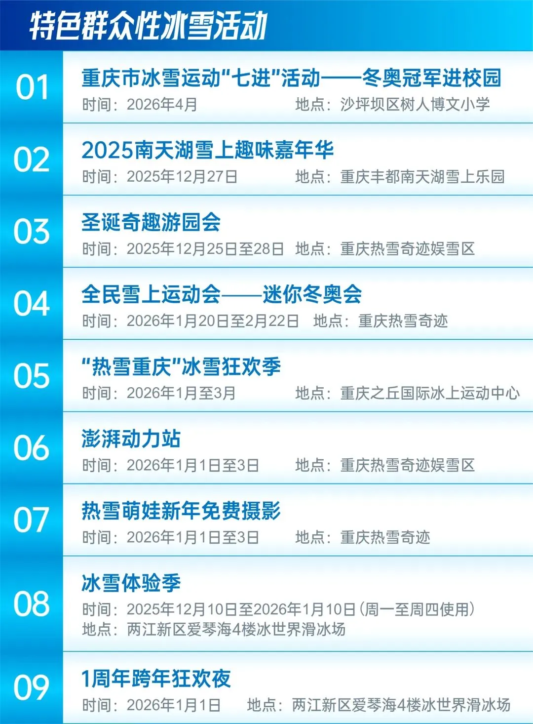为进一步激发全民参与热情,持续推动冰雪运动的普及发展,巩固和扩大“带动三亿人参与冰雪运动”成果,本届冰雪运动季以“新韵重庆·冰雪同行”为主题,将从今年12月持续至明年4月。