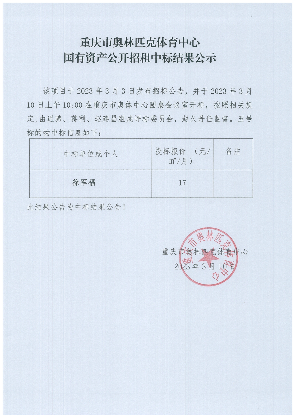 重庆市奥林匹克体育中心国有资产公开招租项中标结果公示(十七号标的物)