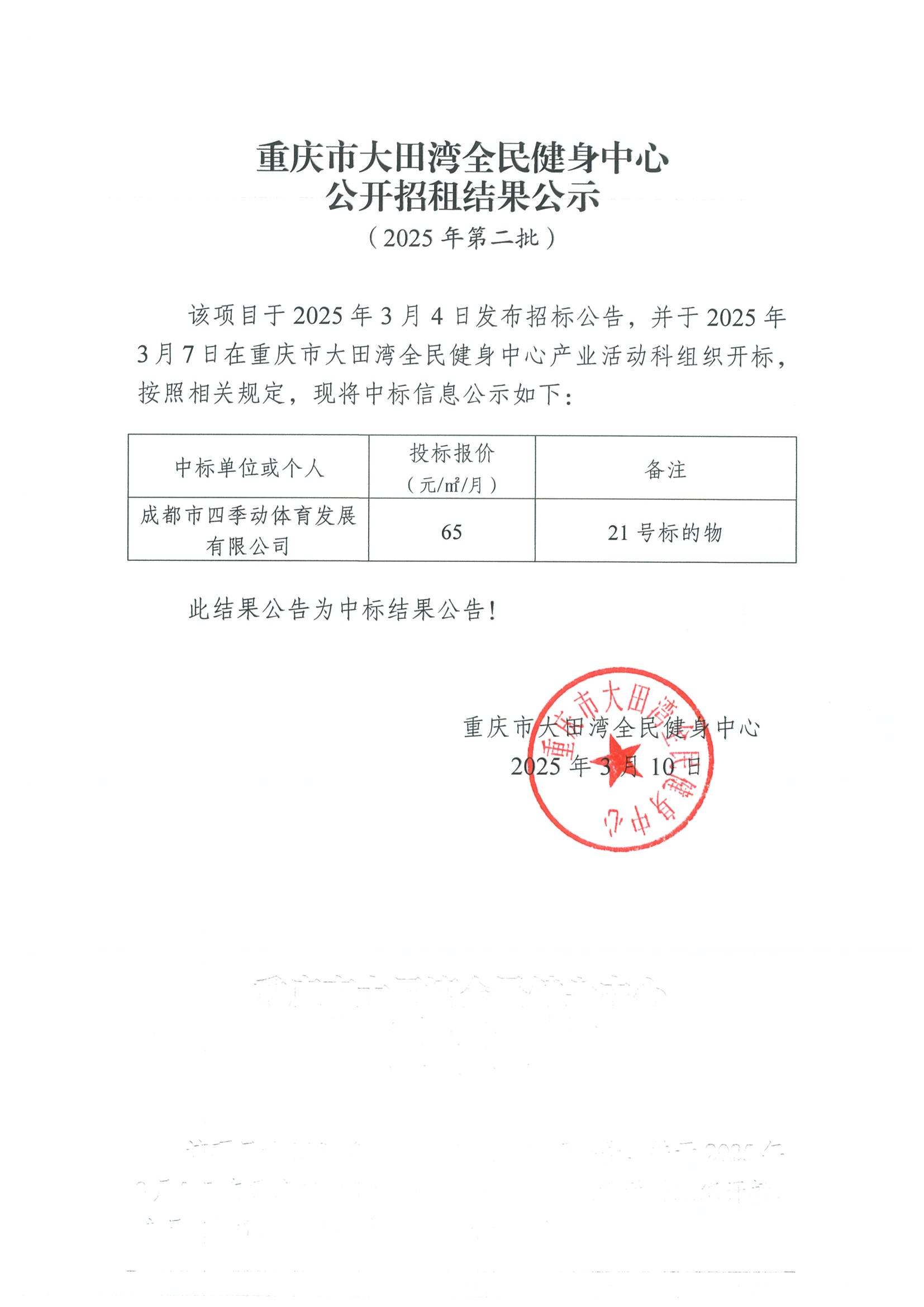 重庆市大田湾全民健身中心公开招租结果公示(2025年第二批)