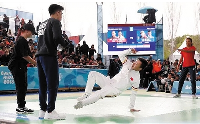 布宜诺斯艾利斯青奥会霹雳舞比赛。 新华社