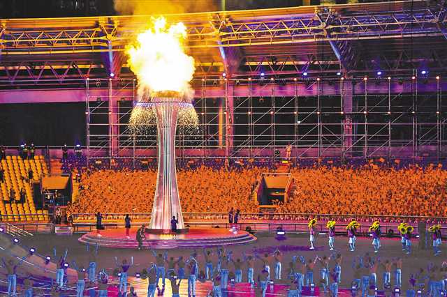 18日晚上9点10分,重庆市青年女篮主力队员李青阳跑入体育场,拉开了圣火点燃的序幕。在现场观众的欢呼声中,她先后与世界围棋“八冠王”古力、重庆市南岸区运动员田雨沁、攀岩运动员马自达以及田径运动员别舸会合,跑到火炬塔下,与由虚拟动捕技术和AR技术合成的六运会吉祥物好运娃娃一起点燃了火炬塔。伴随着圣火的点燃,整个六运会开幕式的气氛被推向了最高潮。