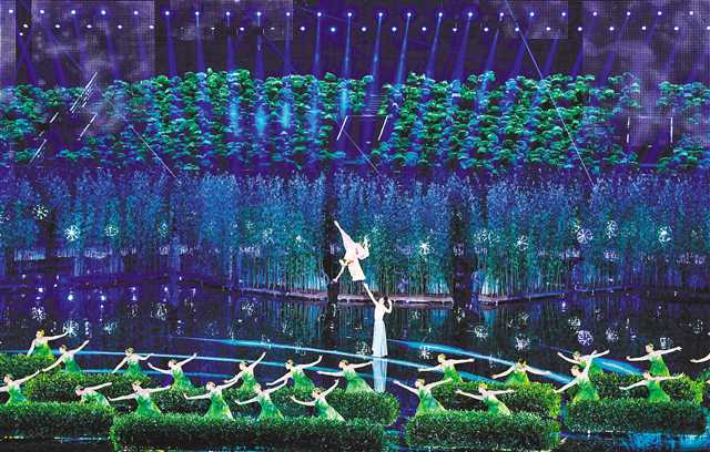 唯美的画面,是此次六运会开幕式文体展演给观众的第一感受。在率先上演的群舞《茶竹飘香》中,伴随着巴渝传统乐曲《太阳出来喜洋洋》的优美旋律,来自重庆文理学院和重庆市渝中半岛艺术团的演员们在“竹海”中翩翩起舞,舞台上方的网幕显示出一幅月照竹林的美丽画面。优美的音乐搭配上演员们曼妙的舞姿,让现场观众如痴如醉。节目的最后,利用全彩投影技术,银幕上显示出“山水之城,美丽之地”八个大字时,现场氛围被推向了高潮。“实在太美了,下次我一定要带家人去茶山竹海,好好领略那里的美景。”市民杨雨欣说。