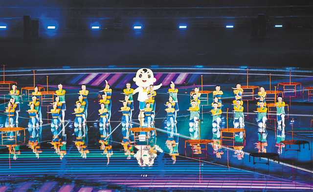 相较于唯美,无处不在的科技感也是本次开幕式的一大亮点。在此次六运会开幕式中,导演团队充分利用声、光、电、数字影像等高科技元素,增强文体展演的科技感,并通过在现场使用VR虚拟现实、全息投影等技术,让观众仿佛身临其境。