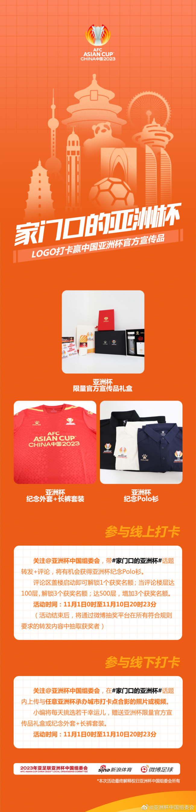据了解,市民在打卡的同时还能参与微博互动,截止11月10日20时23分,关注@亚洲杯中国组委会,带#家门口的亚洲杯# 话题转发+评论10月30日“送福利啦 亚洲杯LOGO打卡,赢官方纪念品”该条微博,将有机会获得亚洲杯纪念Polo衫。