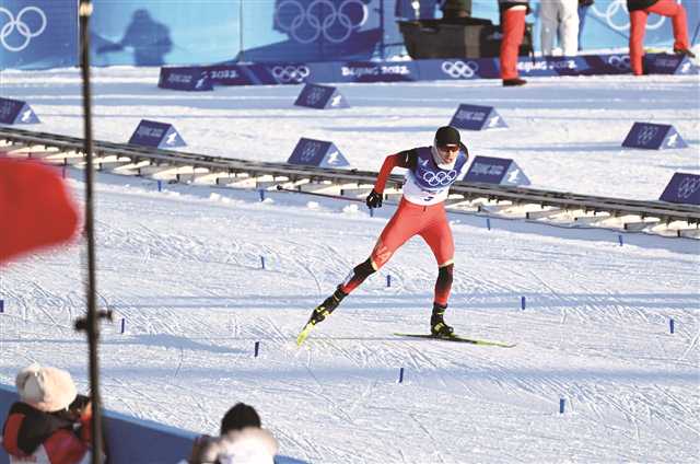 王强在北京冬奥会越野滑雪个人短距离(自由技术)赛上全力冲刺。摄/万难