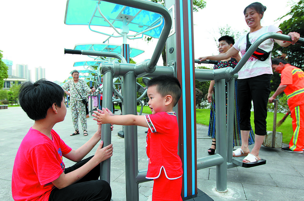 江津区滨江路智慧健身长廊,小朋友在智慧设施上玩耍健身。