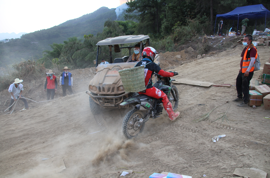 骑在车上,志愿者把水或者救灾药品放进背篼,马上往山上冲,一分钟都不用耽误。从1号点到4号点,来来回回,具体跑了多少趟,代松记不清楚了,大致估计,最少跑了50趟。