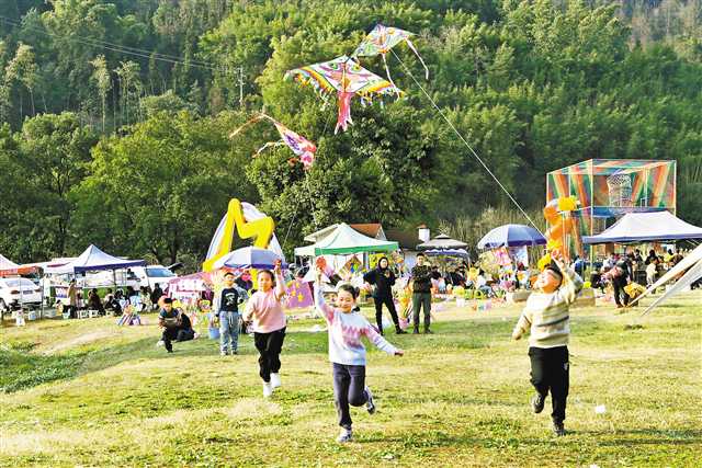 万盛经开区黑山镇鱼子岗村,小朋友在草坪奔跑放风筝,感受运动的快乐。特约摄影 曹永龙/视觉重庆
