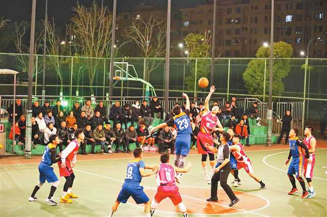 梁平区全民健身中心,篮球爱好者在篮球比赛中争球。特约摄影 刘辉/视觉重庆