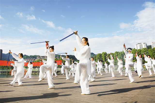 黔江区武陵水岸,太极爱好者展演太极剑。特约摄影 杨敏/视觉重庆