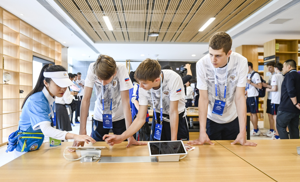 “请问‘你好’用俄语怎么说呢?”“这么读标准吗?”记者在南开两江中学看到,几位中国运动员正围着随团翻译杨妞,兴致勃勃地学习简单的俄语。俄罗斯运动员则用刚刚学会的中文“你好”“谢谢”等,向师生和中国运动员微笑致意。