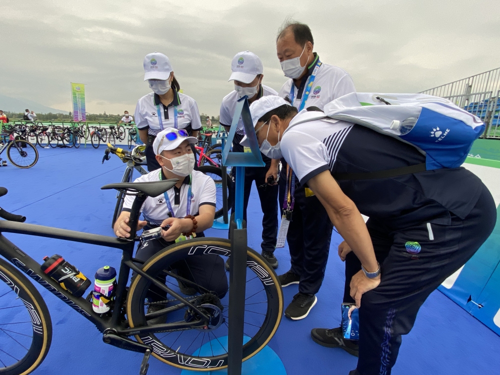 铁人三项裁判员潘星宇(中)在往届比赛中 。 受访者供图