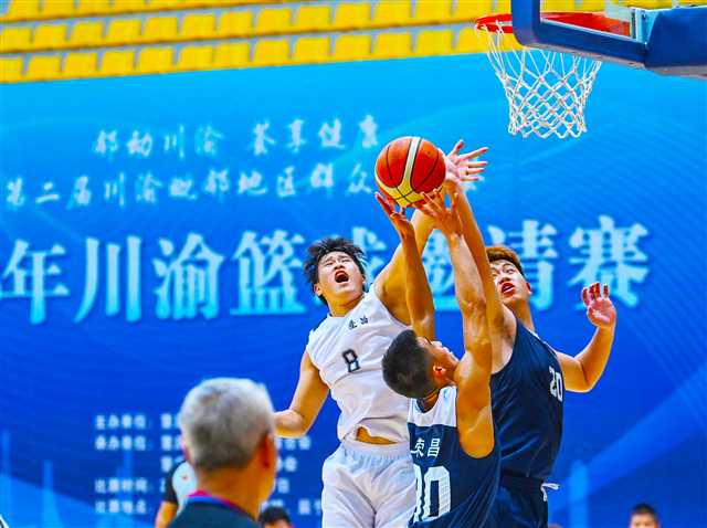 10月17日,2023年川渝篮球邀请赛现场,隆昌队和荣昌队在球场上比拼。