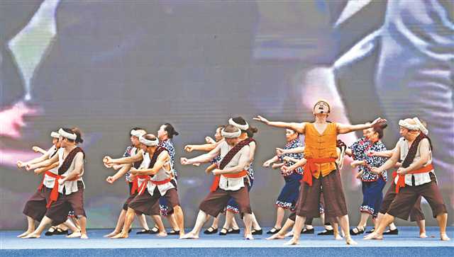 十月十九日,第二届川渝毗邻地区群众体育荟现场,重庆市非遗节目《川江号子》展示表演。