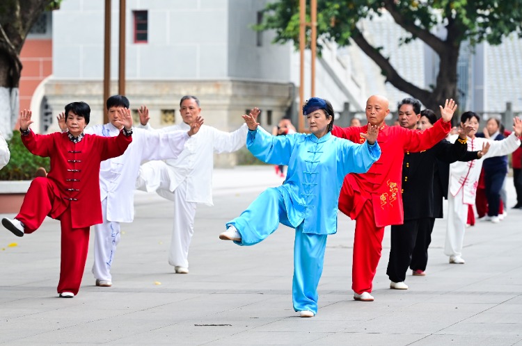 市民在健身广场练太极拳