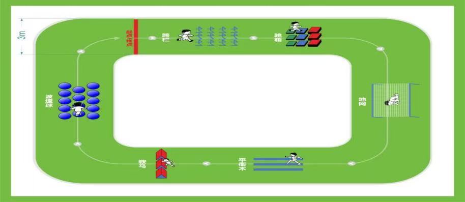 (1)赛道器材:障碍道具包括跳箱、跨栏、地网、三角鞍马、独木桥、波速球阵共计6个障碍。