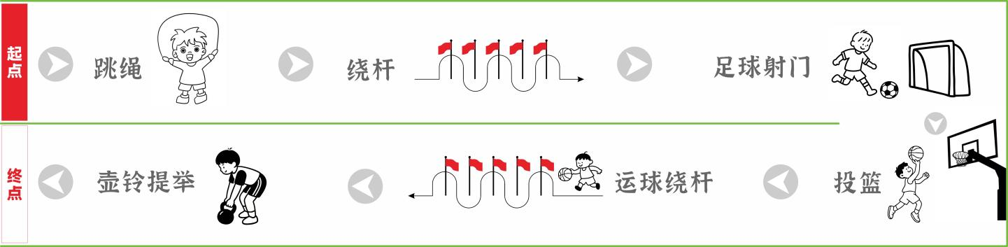 ③ 采用击掌接力方式进行,第一名队员从起终点处出发开始计时,按顺序依次完成原地跳绳15次→绕杆跑→1次足球射门→1次投篮→篮球运球绕杆→壶铃提举后,越过终点线与下一名队员击掌交接,直至本队最后一名队员完成比赛,计时停止,计时取小数点后两位。