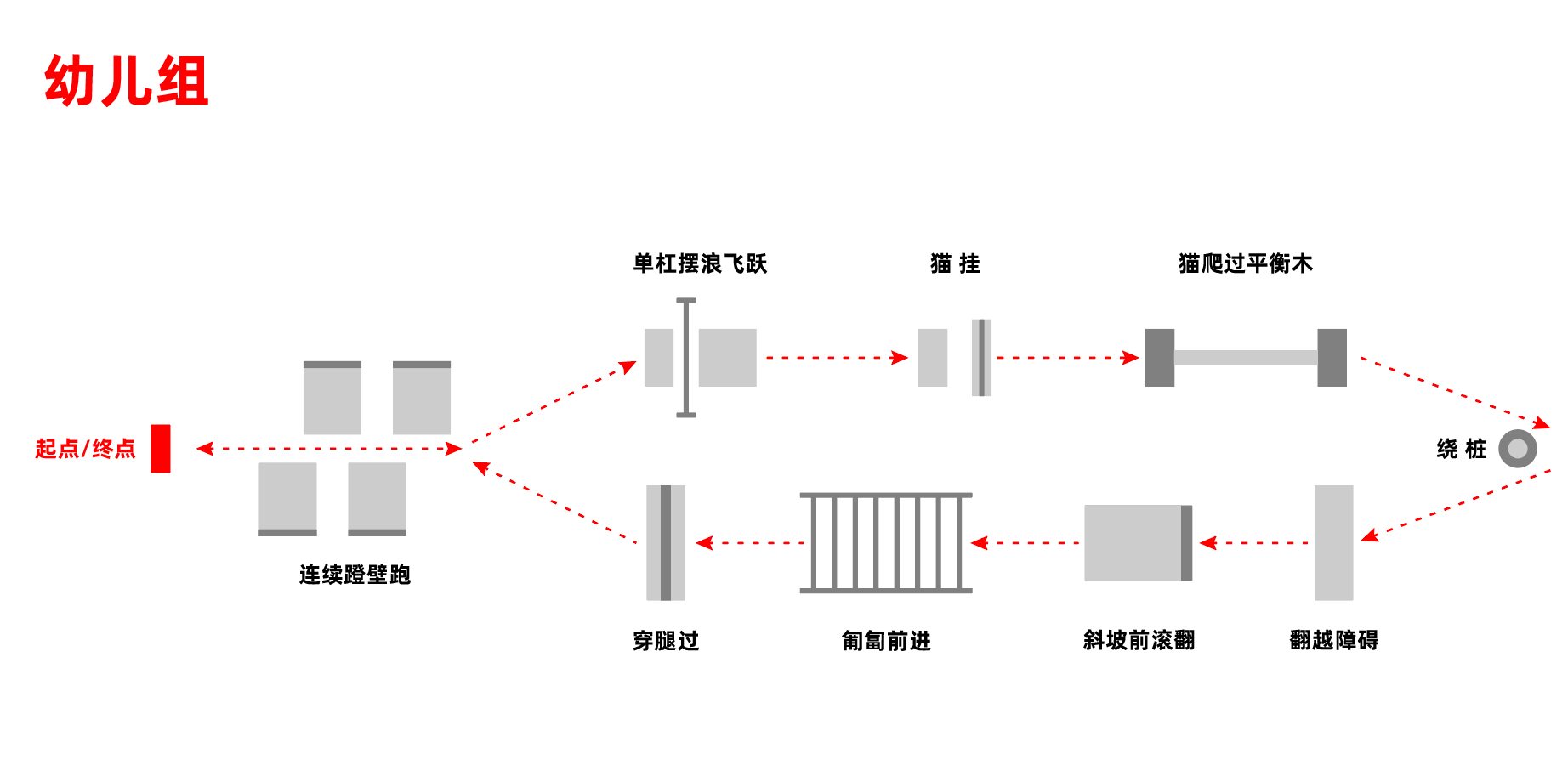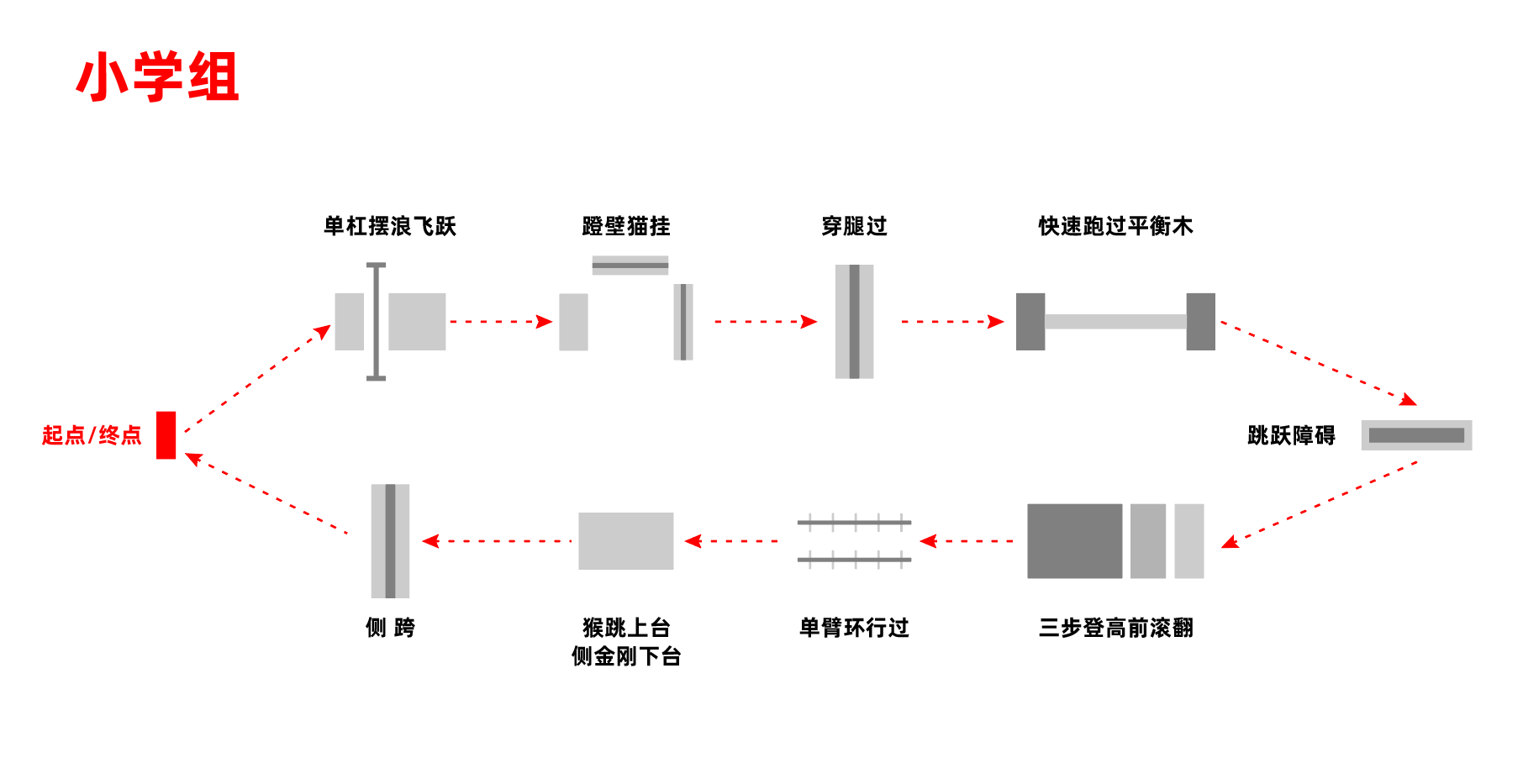 各个年龄组赛道总长度为56米(来回),根据年龄组别不同,在障碍高度和动作难度与间距上有所差别(具体数值由裁判长现场调整)。