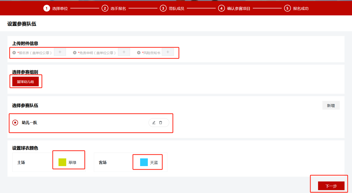 (三)1.上传附件信息(报名表、免责申明、风险告知书);2. 选择参赛组别; 3. 点击“新增”添加参赛队伍,按要求填写信息; 4. 勾选该队伍,设置球衣颜色。确认无误点击“下一步”
