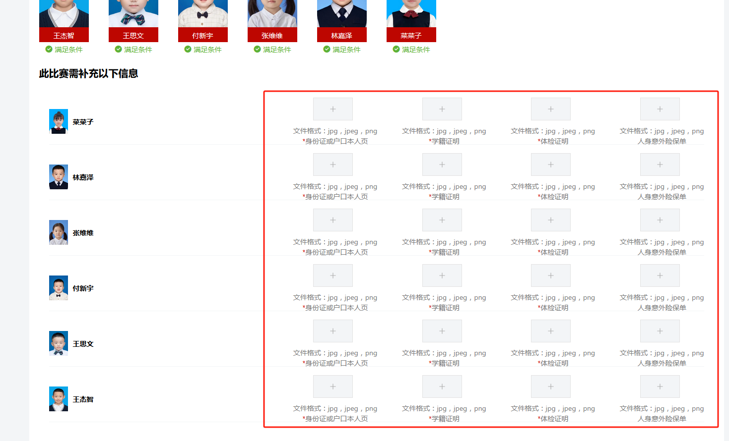 (五)上传对应运动员参赛所需附件:1.身份证或户口本人页、2.学籍证、3.体检证明、4.人身意外保单(报名平台购买保险的无需上传),检查无误后点击“提交”。(温馨提示:报名系统可快捷购买团体保险,可自行购买其他保险,不强制要求购买系统内保险)